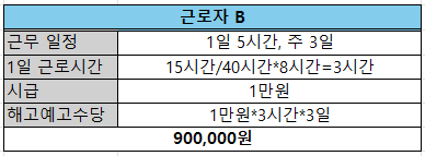 - 1일 소정근로시간 = 15시간 ÷ 40시간 X 8시간 = 3시간