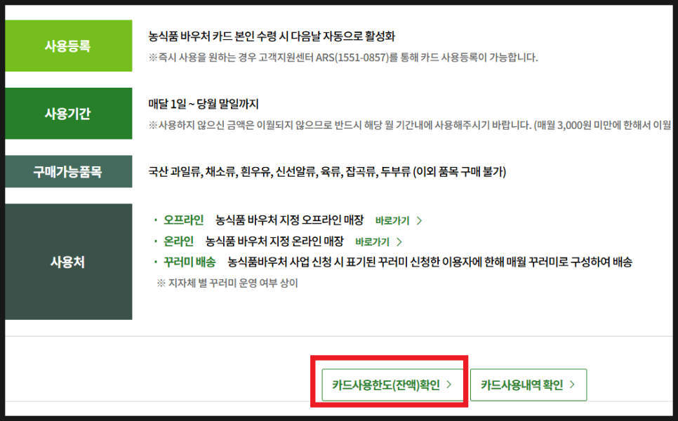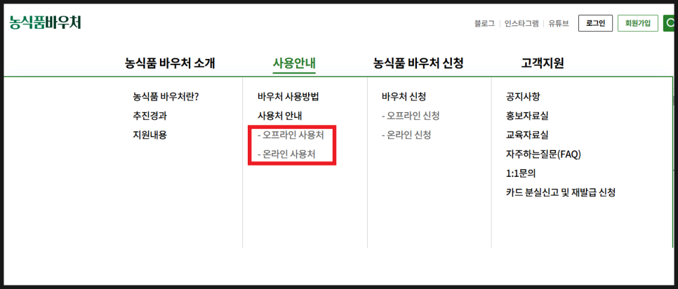 이를 확인하는 방법으로는 농식품 바우처 홈페이지에 접속해 [사용 안내]-[오프라인/온라인 사용처]를 클릭해 확인할 수 있습니다.