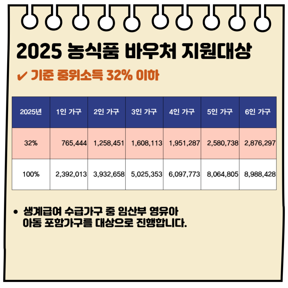 농식품 바우처 지원 대상은 생계급여 (기준 중위소득 32% 이하) 수급가구 중 임산부 영유아 아동 포함 가구를 대상으로 진행합니다.