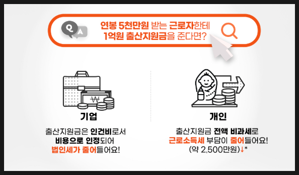 기업 입장에서는 출산지원금이 인건비로 반영되기 때문에 비용으로 인정되어 법인세가 줄어드는 효과가 있습니다.
