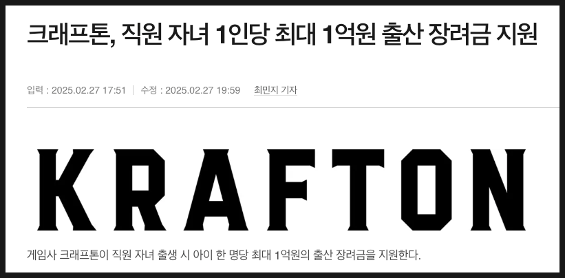 최근 뉴스에서는 국내 게임 기업 중 하나인 크래프톤이 직원 자녀 1인당 최대 1억 원의 출산장려금을 지원해 준다는 내용이 나온 적이 있습니다.
