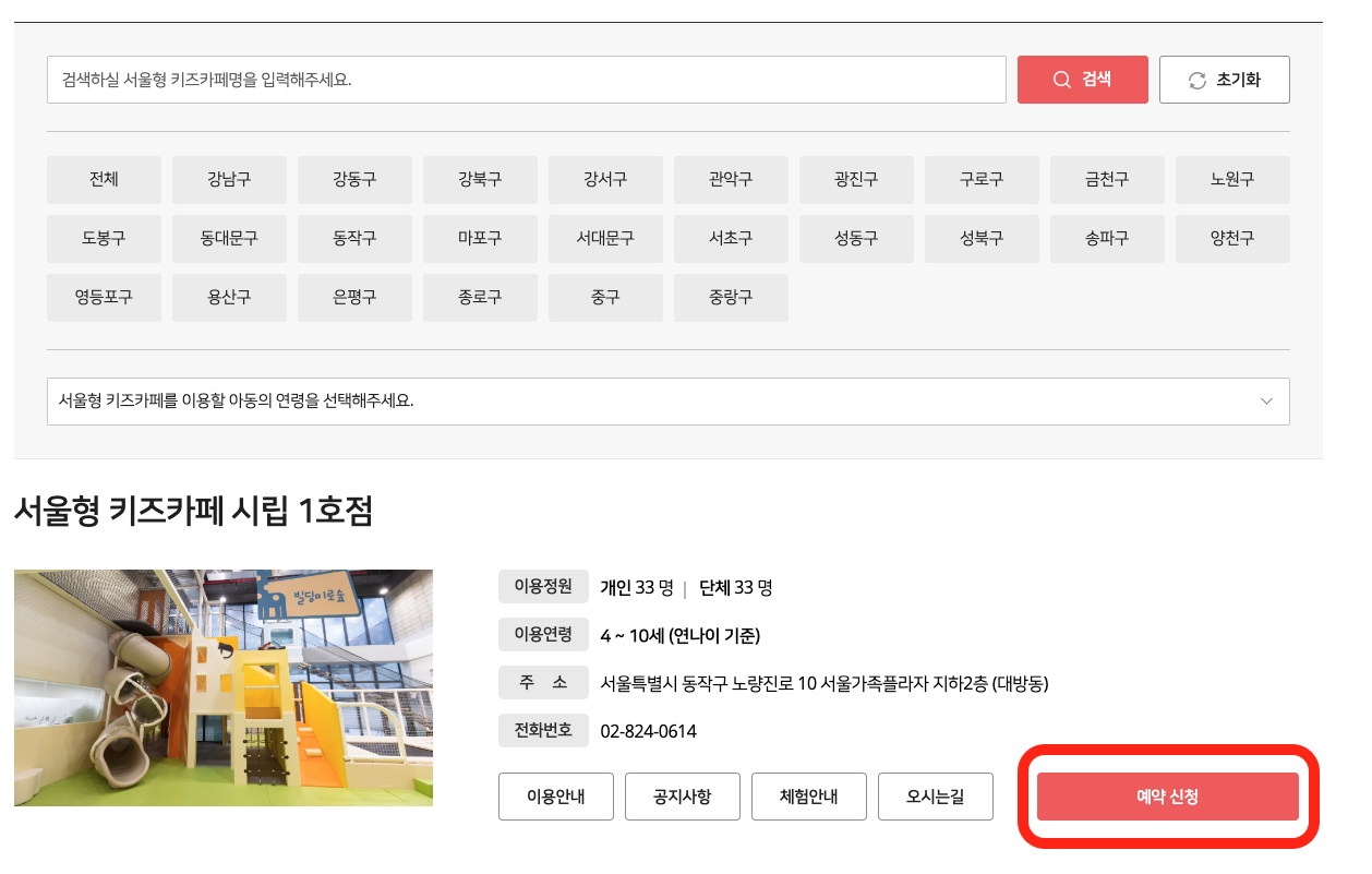 그리고 원하는 지역의 키즈카페를 검색해 [예약신청]을 진행해 주면 됩니다.