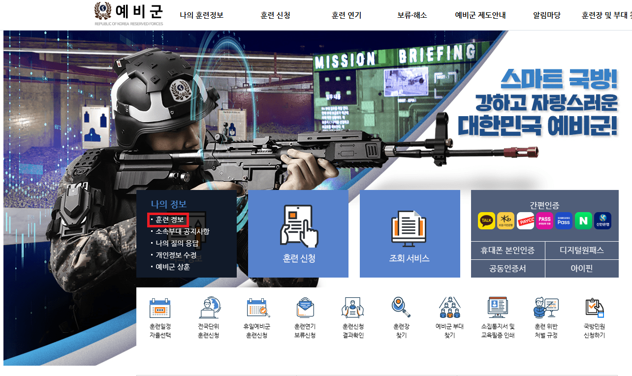 위의 화면처럼 예비군 홈페이지에 접속해 [나의 정보]-[훈련정보]를 검색해 줍니다.