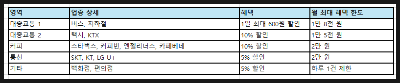 가장 많은 교통수단인 버스와 지하철의 경우 1일 최대 600원까지 할인받을 수 있고, 그 외 전기 요금, 통신요금 등 캐시백 혜택이 있는 카드입니다.