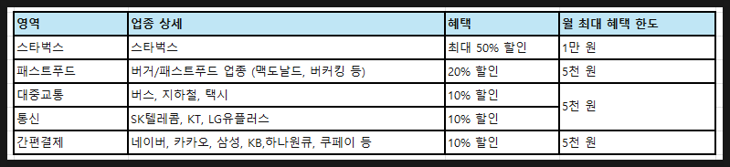 커피값뿐만 아니라 자취하시는 분들은 패스트푸드에서 식사를 하는 경우가 많기 때문에 패스트푸드점에서 할인 혜택도 제공해 주고 있어서 사회 초년생 분들의 맞춤 신용카드인 것 같습니다.