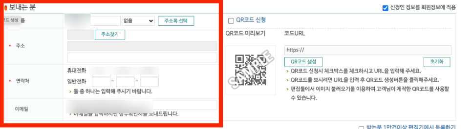 3. 보내는 분에 본인의 성명과 주소 연락처를 입력해 줍니다.